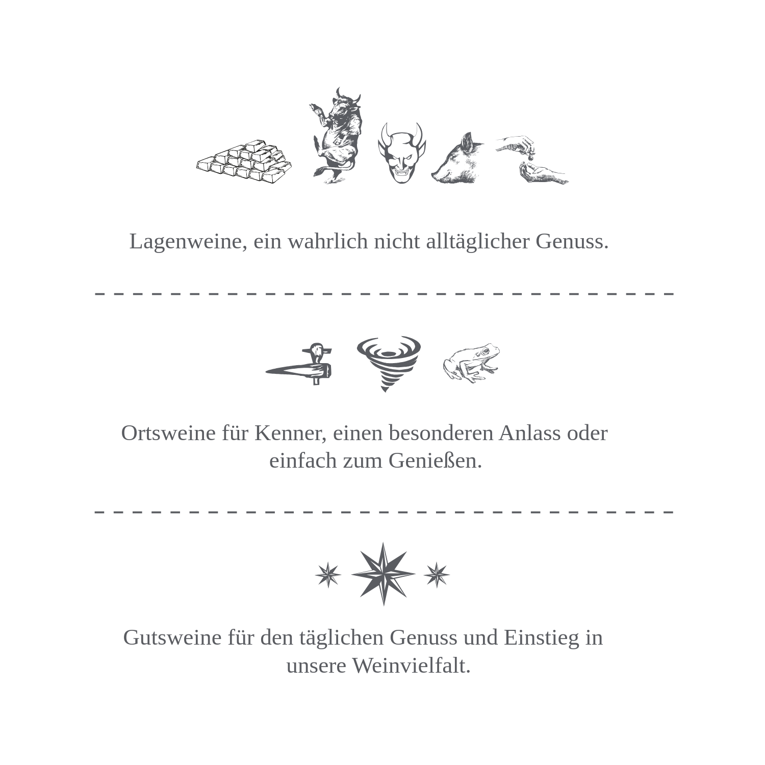 - Ortsweine: zeigen, was unsere Heimat ausmacht. Die besten Lagen konzentriert auf ein Weindorf, mit Charakter und vom Terroir geprägt.